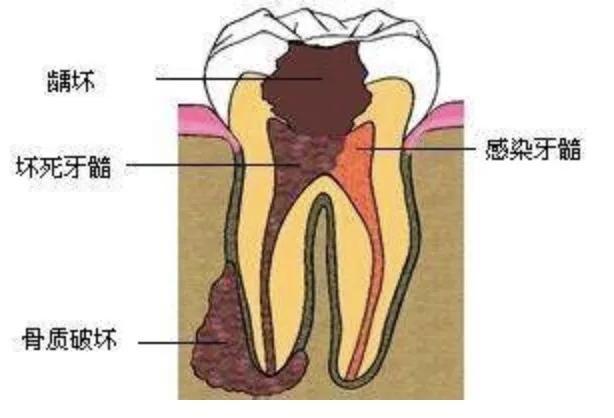 牙髓壞死后當(dāng)中會出現(xiàn)一些細(xì)菌,導(dǎo)致牙齒逐漸變灰、變黑、變脆等;如果不及時治療,這些病菌會通過根尖空傳輸?shù)礁獠课唬瑒傞_始會形成根尖的炎癥,后來會出現(xiàn)慢性的頜骨骨髓炎,更甚的會延發(fā)成面部瘺口。還有牙齒會出現(xiàn)裂開、斷掉等癥狀,所以需要處理。