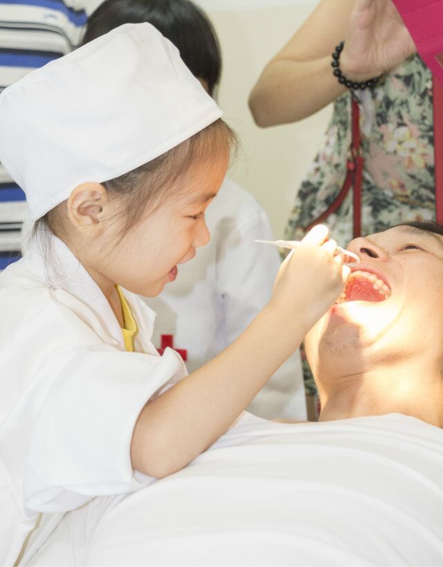 哇,一批穿著白大褂的“小牙醫(yī)”出現(xiàn)在眼前,掀起了活動的高潮。在醫(yī)生叔叔、阿姨的指導(dǎo)下,小牙醫(yī)上崗操作,檢查起爸爸媽媽的牙齒,毫不怯場�?�,還真有醫(yī)生的架勢呢!