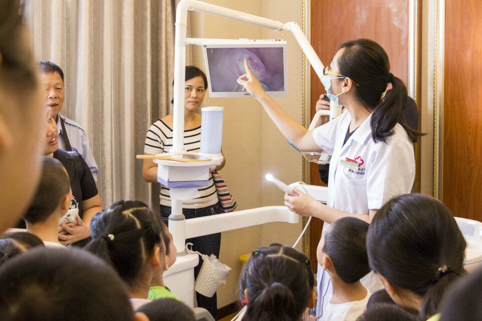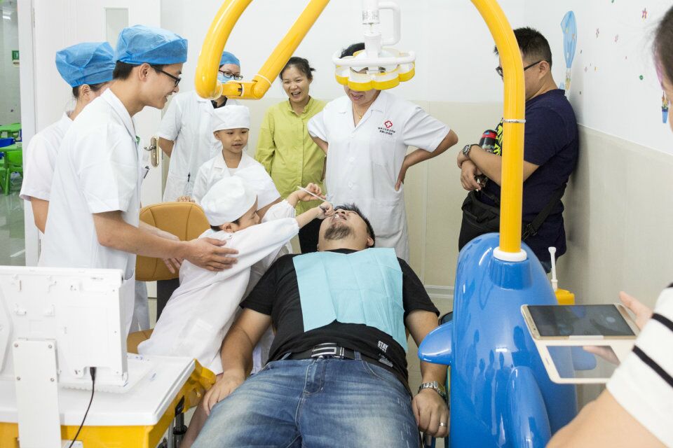 好了,設(shè)備操作會(huì)了,口腔知識(shí)也學(xué)到了,“小牙醫(yī)”們開始上崗啦!在醫(yī)生叔叔、阿姨的指導(dǎo)下,小牙醫(yī)們有模有樣的為爸爸媽媽檢查牙齒呢,有的“小牙醫(yī)”對(duì)爸爸媽媽的口腔情況還分析得頭頭是道,贊一個(gè)!
