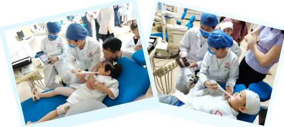 看,小牙醫(yī)們?cè)卺t(yī)生的引導(dǎo)下有模有樣地給自己的爸爸媽媽檢查牙齒。