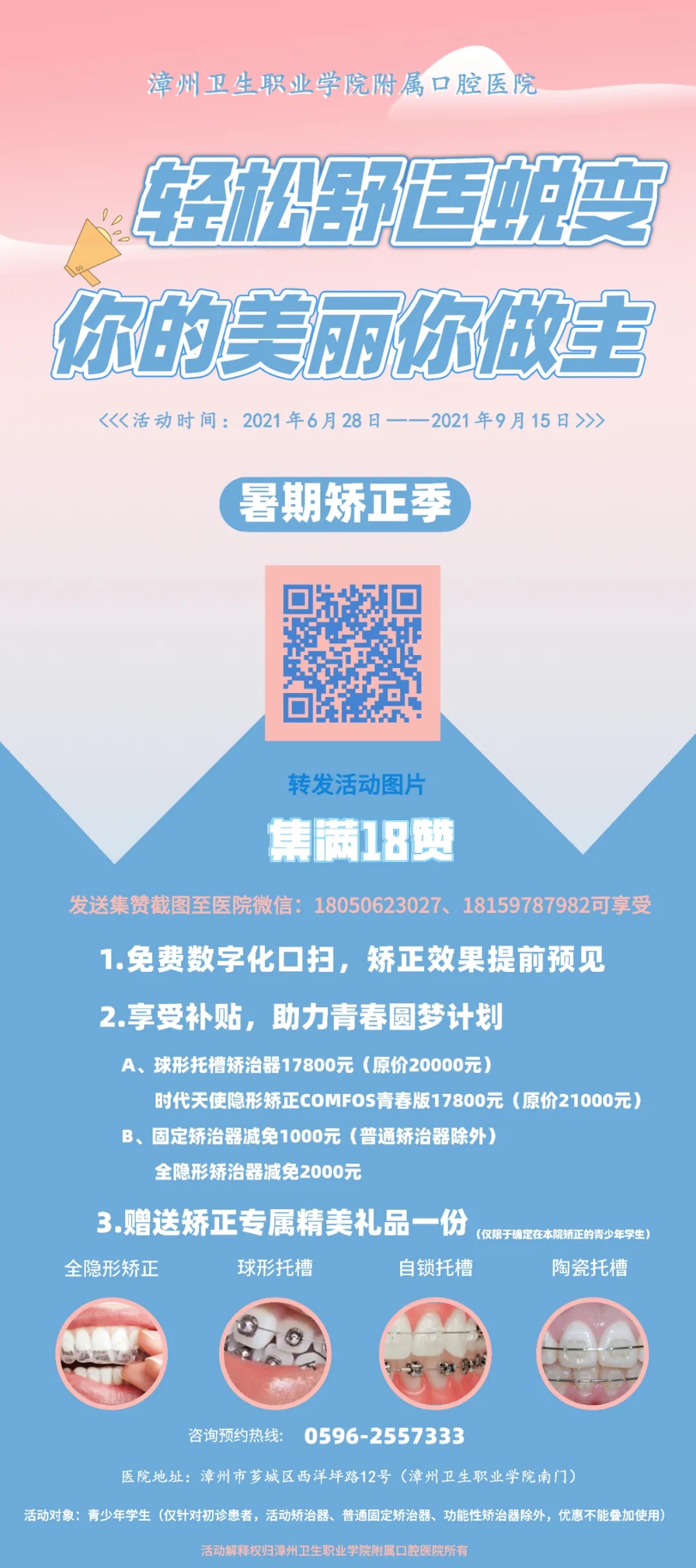 1、將暑期牙齒矯正活動(dòng)圖片轉(zhuǎn)發(fā)到朋友圈,并集滿18個(gè)贊,將截圖發(fā)送到醫(yī)院微信,微信號(hào)1:18159787982、微信號(hào)2:18050623027,即可參與以下暑期牙齒矯正活動(dòng)::